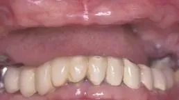 After: Great smile, chewing function, and facial tissue support possible with an Upper Denture that is supported with Implants and Lower Implants and Crowns.